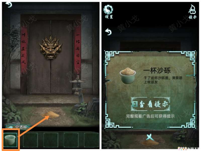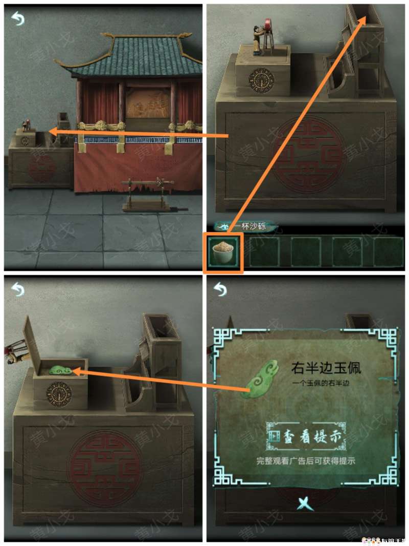 17.(画中-房间)点击戏台旁边的沙漏,放入【一杯沙砾】;触发机关,打开盒子,获得【右半边玉佩】