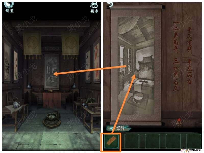 25.(画中-庭院)去到刚才的房间。查看画上的题字,放上【剪纸蝴蝶】;用【火折子】点燃香