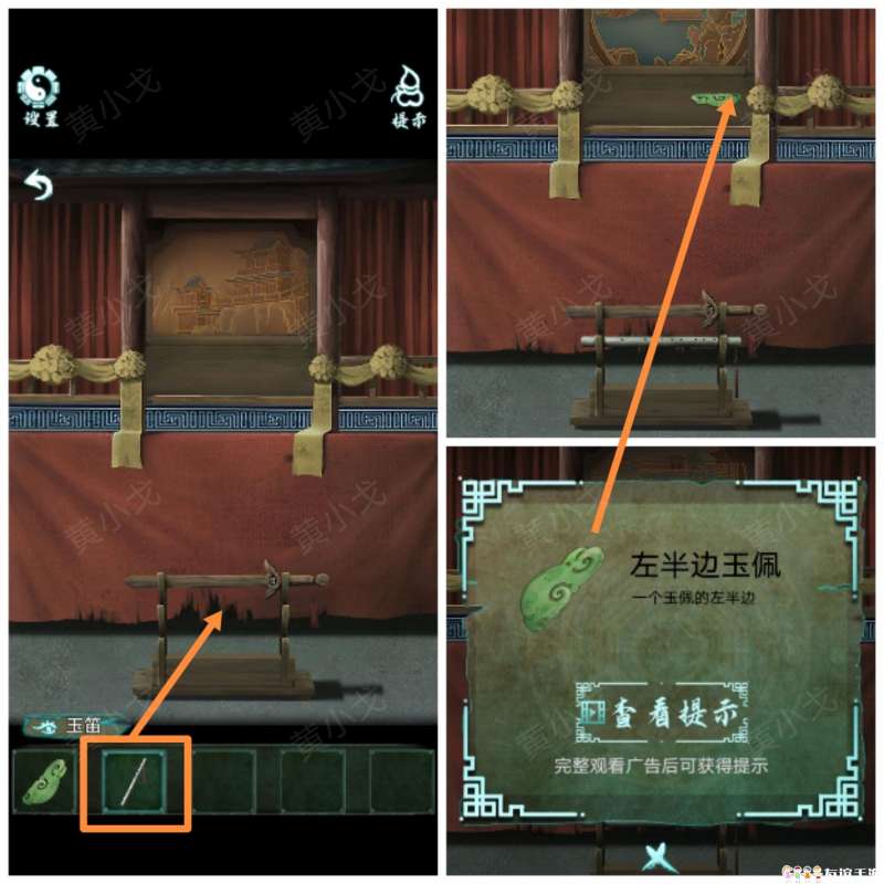 19.(画中-房间)点击戏台,把【玉笛】放到架子上,看木偶戏;在戏台上获得【左半边玉佩】