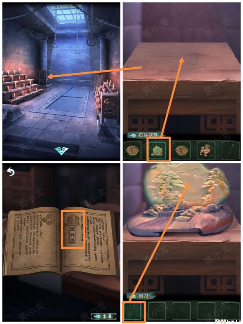 21.(画中-暗室)点击左上角的石台,放上【石头摆件】;用【刻刀】刻字