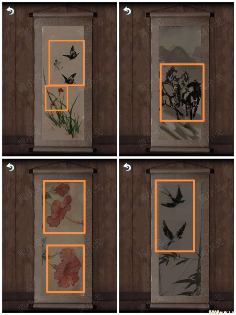 4.点击右边椅子上的盒子,根据上面的提示(图案:蝴蝶、马蹄、花、燕子),结合四幅挂画上的线索,调整对应滑块的位置(数量,蝴蝶-3、马-4、花-5、燕子-2)(蝴蝶那副画上的两朵花也要算上去)