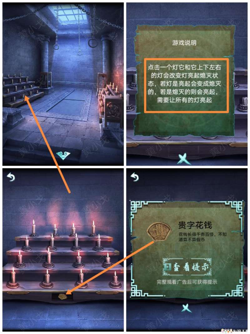 19.(画中-暗室)点击左边的蜡烛,查看游戏说明,完成点亮蜡烛小游戏;打开暗格,获得我【贵字花钱】