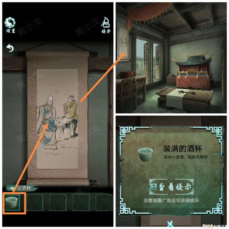 12.点击墙上的饮酒图,用【空酒杯】装画里的酒,获得【装满的酒杯】