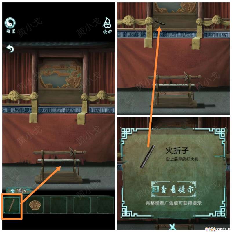 24.(画中-房间)点击戏台,把【镇尺】放到架子上,看木偶戏;在戏台上获得【火折子】