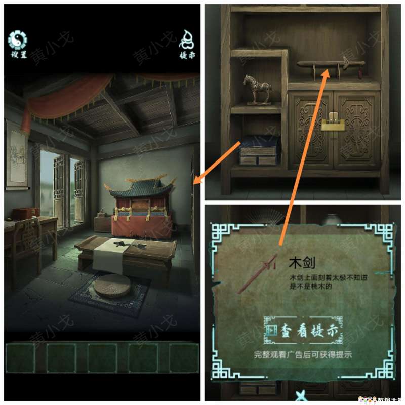 13.点击戏台,把【木剑】放到架子上,看木偶戏;在戏台上获得【柜子钥匙】