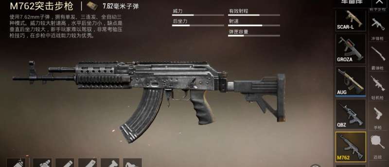 在和平精英被称作猛男枪的m762也是获得很多玩家的喜爱,因为他是7.62mm子弹的枪械中配件最多的一把枪。只要玩家集齐了配件,他的后座力就是这些枪中比较低的非常适合近距离的战斗,因为它伤害很高。在远距离战斗时,也开开启单发模式,靠着高倍镜,给对面造成大量伤害。