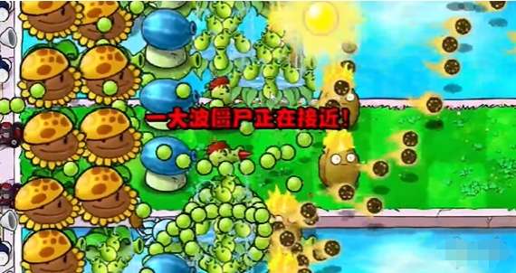 3、第一波僵尸出现之后放置火炬坚果、豌豆许愿池、冰瓜大喷菇。