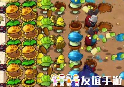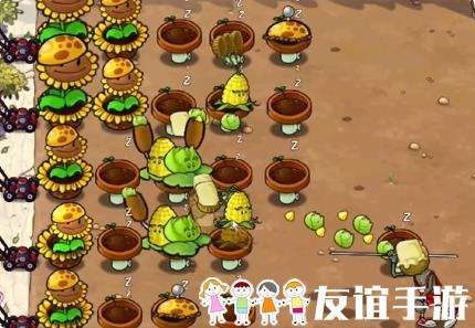 4、然后补充中间的玉米卷香蒲和三行玉米投手,在右侧种植一列冰冻西瓜大喷菇。