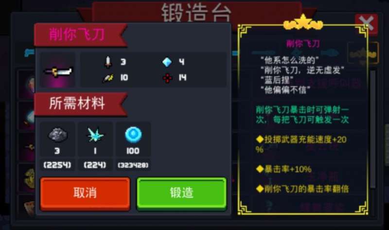 最后一把是削你飞刀,也是目前迷迭岛版本最强的一把武器。虽然伤害不高,只有3点,但是它有一个极强的特性,那就是弹射加穿透。这个武器的弹射可不是像弹射冲锋枪那样在建筑上弹来弹去,它在命中对手之后,只要产生了暴击,就可以弹射到其他的敌人身上。而三阶的削你飞刀又有着高达40%的暴击几率,可以轻松击败许多的敌人。搭配上暴击提升,散弹提升,在迷迭岛这种小怪居多的地图,杀得速度比小怪刷新的还快,绝对的清怪T0武器。