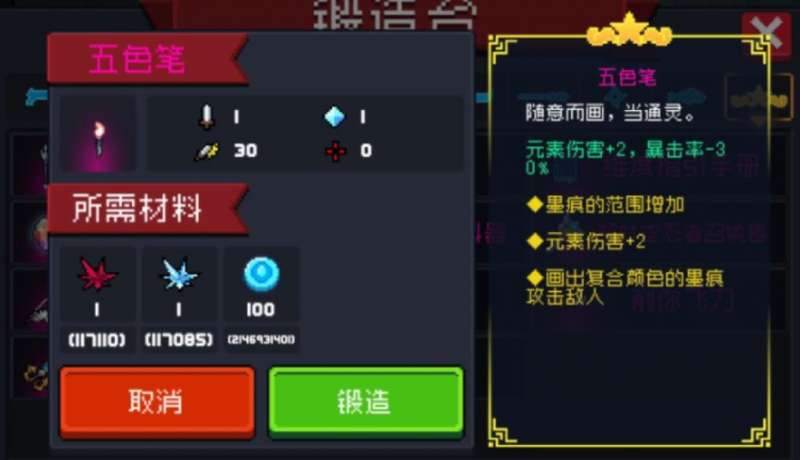 五色笔是专门打元素伤害的近战武器,五色笔攻速十分优秀,每一次攻击都会采用一种不同的颜色,根据颜色的不同,最后打出来的元素种类也会有所差距。获取它之后,自身所有武器的元素伤害都会提升2点,但是暴击率会大幅度下降,要注意武器的搭配。一级的五色笔可以增加自身的攻击范围,增幅之后的攻击距离可以与蓄力的血刃媲美。二级会再次增加自身的元素伤害,三级的五色笔,每次攻击不再是只用一种元素,而是会随机出现两到三中颜色,进行复合攻击,虽然单次伤害不会提升,但是触发的元素种类会变多。专门当做近战武器的五色笔就相当不错了,再加上它独特的元素增幅,只要将其放在副手位,就能提升4点元素伤害,配合一些法杖使用也相当的不错。