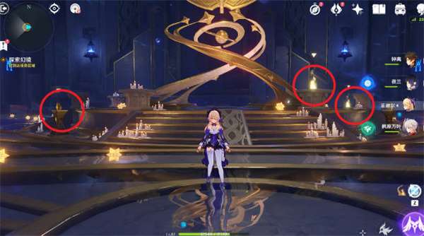 1:进入秘境之后,我们来到中心的水池旁边,然后我们把三个任务道具拿到手,如图所示的红色圈圈的位置;