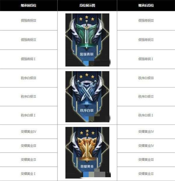 青铜、白银、黄金段位继承:青铜、白银段位不变,黄金段位掉一个小段(不会掉到白银)。