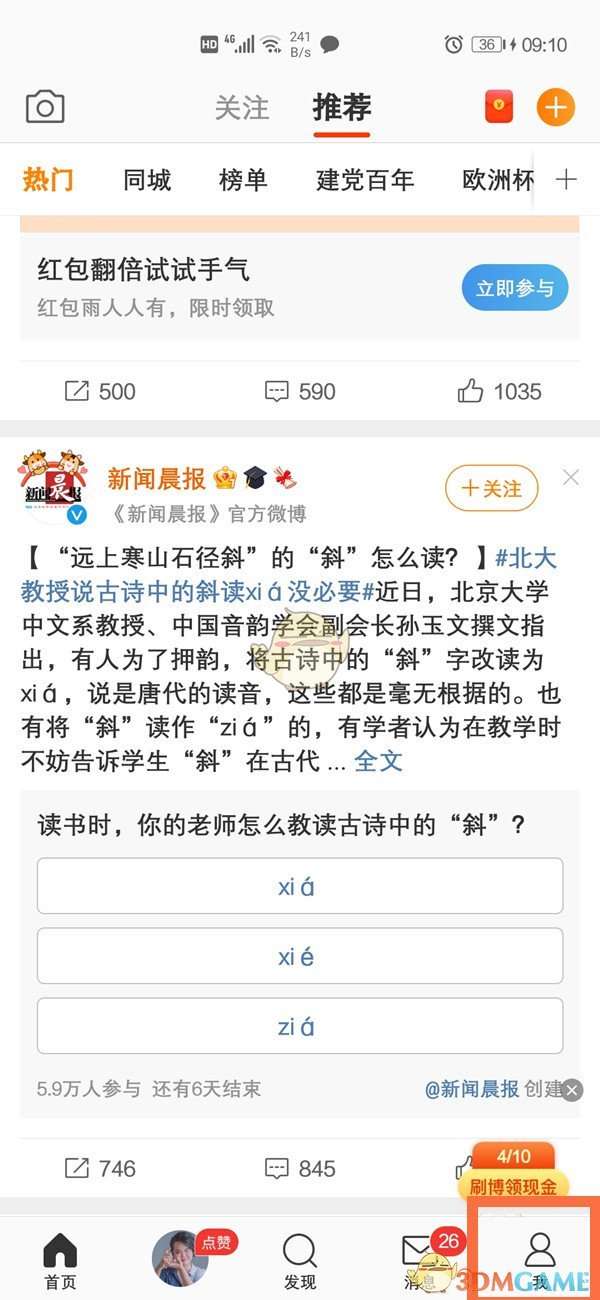 1、打开手机微博APP,点击底部【我】进入个人中心(如图所示)。