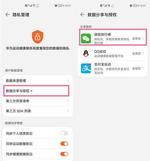 2、点击数据分享与授权,点击微信排行榜,解绑即可。