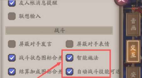 3、跳转面板后,将智能施法和自动战斗技能可选勾选上。