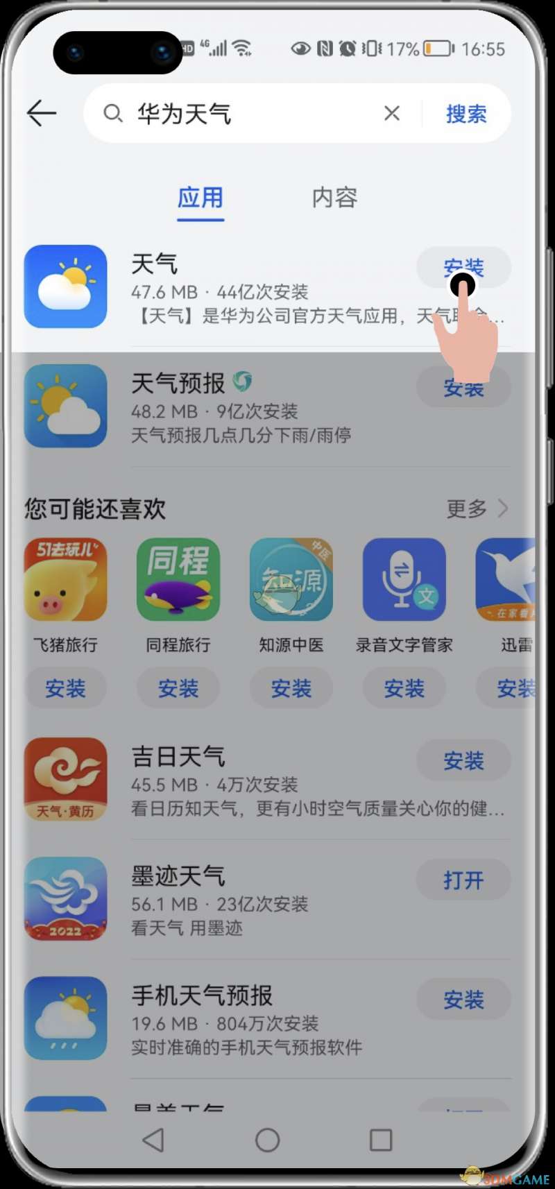 方法二:请您在应用市场中搜索华为天气,出现天气应用,点击安装。