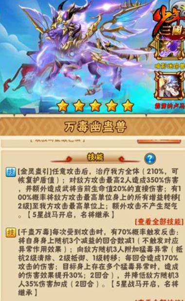 第三个介绍的是万毒幽蛊兽,其技能名为金灵蛊引,在受到任意攻击以后,就会治疗我方全体百分之两百一,还会对敌方攻击最高的两个人造成百分之三百五的伤害。并且有百分百的概率将敌方一个人的增益效果,转移到我方攻击力最高的角色身上。其二技能名为千蛊万毒,在每次受到攻击的时候,都会有百分之七十的概率触发反击效果,让我方某个武将身上随机一个减益效果的回合数减一。还会在敌人身上施加一个猛毒异常的效果,能够抵抗敌方的清除、抵御、转移等效果。当敌人身上本来就存在着多个猛毒异常效果的时候,那么两回合内就会对其造成的伤害增加百分之三十。