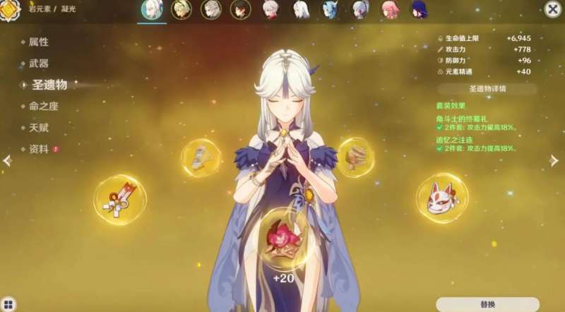 第四套推荐圣遗物是散件,可选择两件套的磐岩加上两件套的角斗或追忆。其中前者可增加凝光百分之十五的岩属性伤害加成,后者则会提高攻击力。这套装备不仅能够提高凝光整体的伤害能力,而且还比较容易获得,日常刷刷世界boss就有概率收集全了。第五套推荐的圣遗物是两件磐岩加上两件宗师,这套可直接增加凝光大招所能造成的元素伤害,能够让其在战场上快速对敌人进行速切。但是需要注意的时候,该套装备对凝光的额外输出手段,例如重击、星璇击等无任何加成。