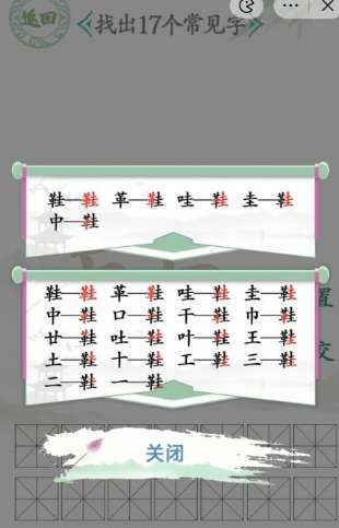 好啦~一览完汉字找茬王鞋找出17个常见字的答案,你是不是就觉得比较容易通过此关了呀~更多有关汉字找茬王手游的游戏攻略与活动资讯还请多多关注我们本站的不断更新哟~