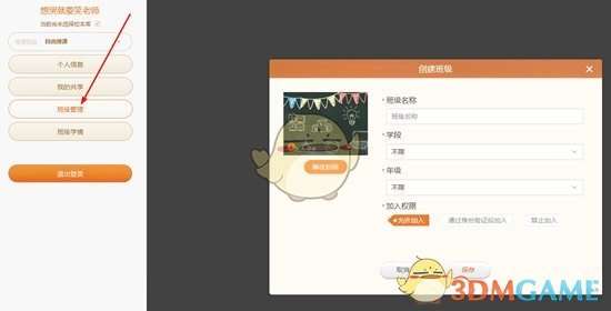 1、首先点击左上方的“个人信息头像”,进入到个人信息的界面后,在左边的栏目中选择“班级管理”功能,如果用户之前还没有创建过班级,将会弹出创建班级的界面,选择输入完毕后,点击“保存”即可进入到下一步,如下图所示:
