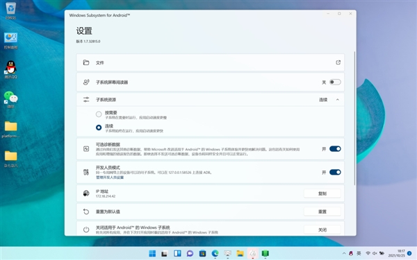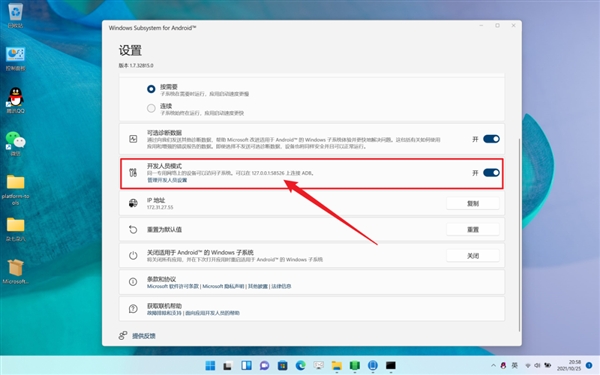 然后在 WSA 开启 “ 开发人员模式 ” 并记录下它给你的 IP 地址( 不同电脑 IP 地址可能有所不同,比如我的是 127.0.0.1 : 58526 ):