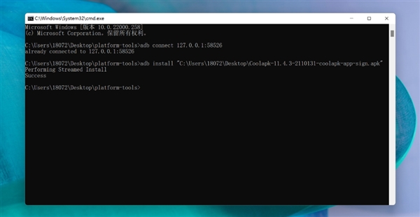 此时如果界面出现 Success 字样,那就代表酷安已经成功安装在安卓子系统里了,酷安里的所有软件你都能随便下!