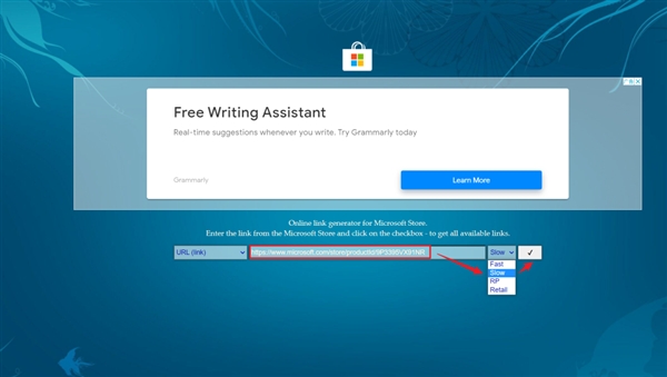 在https://store.rg-adguard.net这个网站,输入https : //www.microsoft.com/store/productId/9P3395VX91NR,然后右侧选中 Slow,点击勾号。