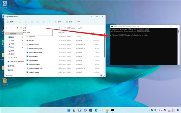接着再打开前面解压好的 adb 工具包文件夹,在文件夹上方地址框里输入 cmd 回车调出 cmd 界面: