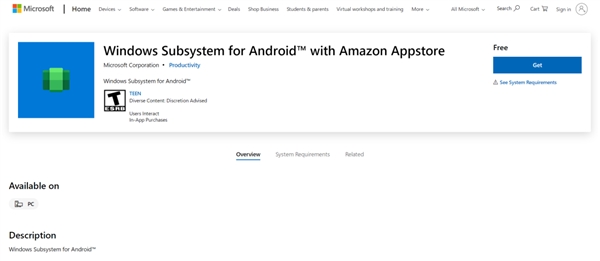 如果你的系统正好是美区 Beta 版,那么你直接在微软自带的应用商店就能下到 Windows Subsystem for Android? with Amazon Appstore。