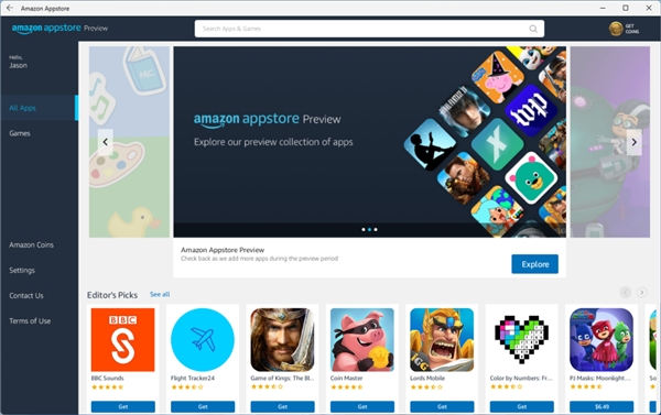 做完前面这一步,其实各位已经可以在自己电脑上安装和运行安卓软件了,你只需运行 WSA,然后打开 Amazon Appstore,选择一个软件安装即可。