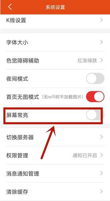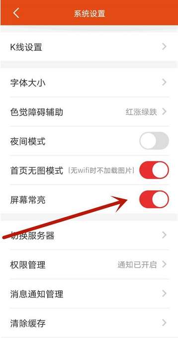 第五步:当屏幕常亮按钮带有颜色,这时使用同花顺时手机屏幕会常亮。