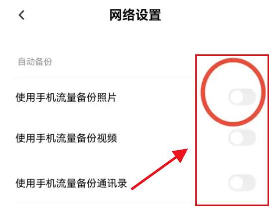 3、将使用手机流量备份照片、视频、通讯录右侧开关全部关闭即可。