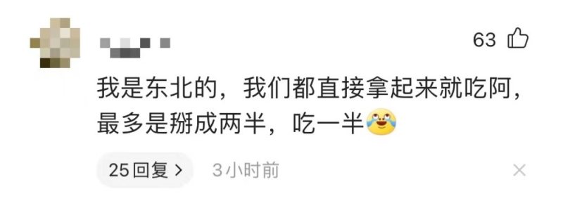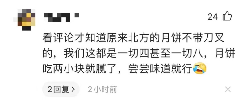 北方网友则表示,吃月饼主要分为三步,第一步将包装袋拆开,第二步拿在手上,第三步直接开吃,“我是北方人,朋友送了一盒广式月饼,小巧精致,孩子一口一个,吃完了问为什么盒子里有刀叉,我告诉孩子,放心吧,你用不上。”