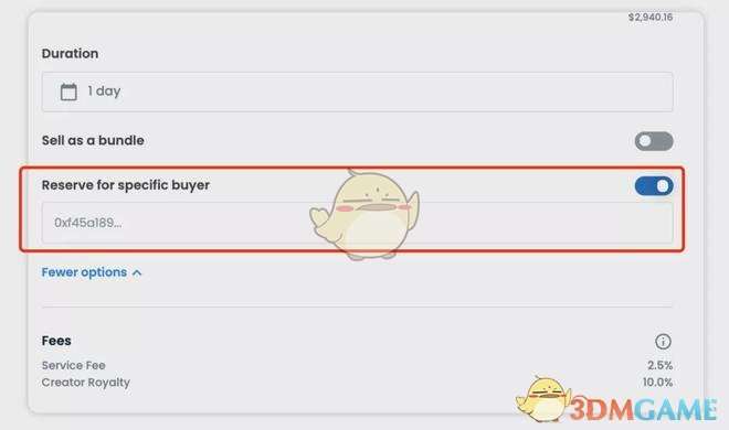 4、最后,你还可以将单品指定卖给一个买家。要做到这一点,只需要将他们的钱包地址粘贴到“Reserve for a specific Buyer”(预定给特定买家)。