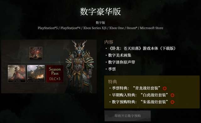 小编了解到,预购《卧龙:苍天陨落》标准版游戏可得“白虎战铠”,截止 2023 年 3 月 16 日。