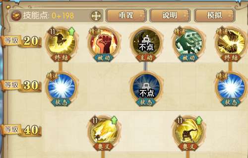 2、20级~40级这里,六王枪点满,将其伤害最大化。另一个终结技点11级备用即可。然后中间的那个主动技和状态不点了,原因是不好用,也没它位置了。