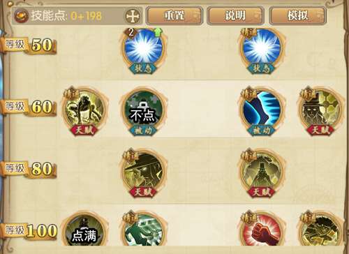 3、50~100级这里,直接看一下,被动血量不点。然后我这里是2觉,所以留下了198点给100级最左边的那个天赋。