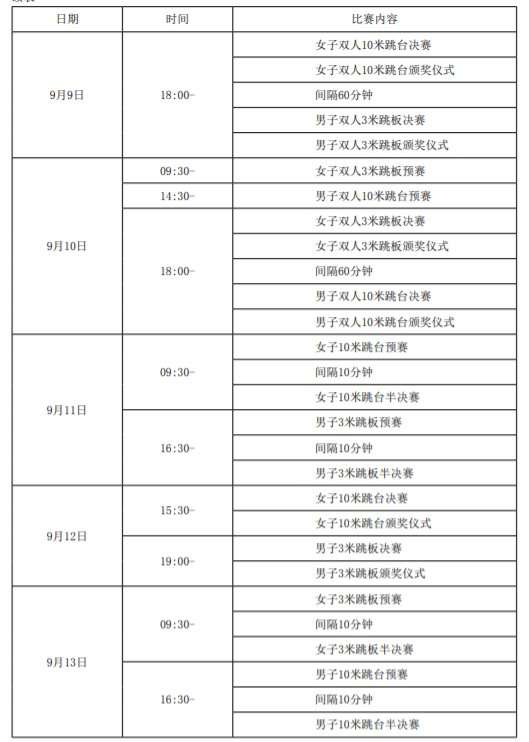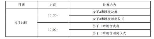 女子:3米跳板、10米跳台、个人全能、双人3米跳板、双人10米跳台、团体.