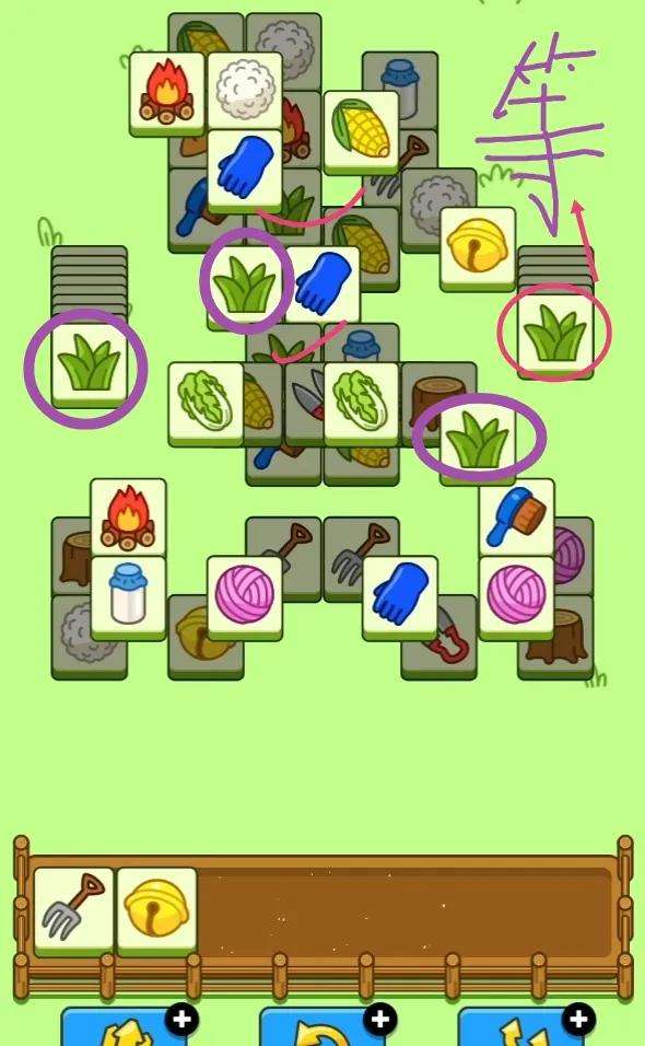 2、同层可以三消的就先消除同层,没有的话就需要查看下一层的物品,然后将需要的物品的上方的道具放置到槽中获得下方的道具。