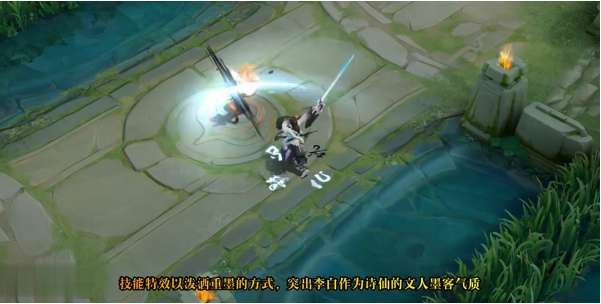普攻所产生的技能特效会带有一笔黑色的墨水,再结合一道银色的剑气,突显了李白的文人和剑客的气质。