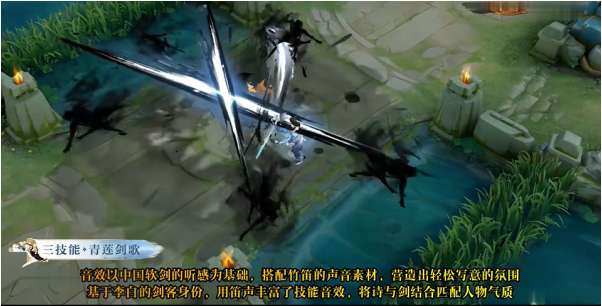 李白的大招音效是以中国的软剑为基础的,搭配率竹笛为辅,技能在释放后会出现四道由墨水组成的人影。