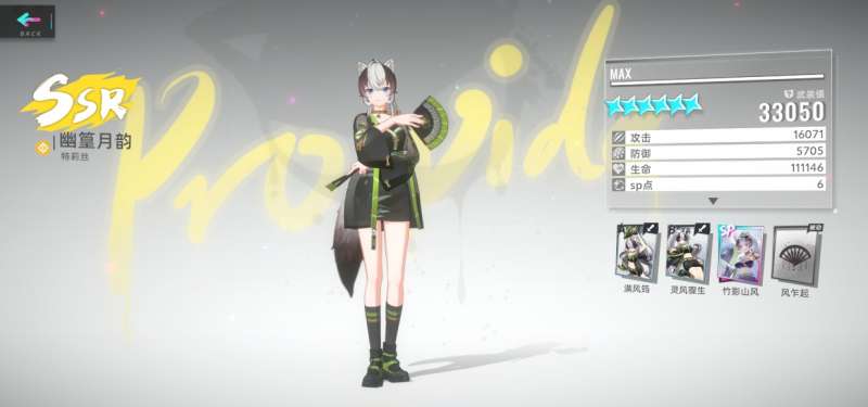 目前猫城中唯二的间接伤害武装,间接伤害无视防御伤害减免的机制相当强力,全技能跟烈风有关,但叠层的速度较慢成为了她的短板,如果后续有新的能辅助叠加烈风的武装出现,那幽篁月韵的技能会变得更加好用。