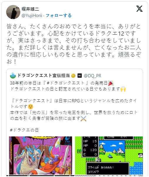 堀井雄二今天表示,首先非常感谢大家在今天发来的纪念日祝贺。
