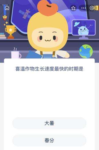 2022支付宝蚂蚁新村7月22日的题目为:喜温作物生长速度最快的时期是?大暑还是春分呢?可能还有很多小伙伴都不太清楚。下面小编就为大家带来了正确答案分享,还不知道这道题目正确答案的小伙伴们快一起来看看吧!