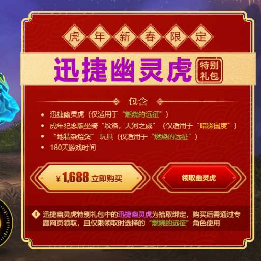 虎年坐骑的半年卡礼包是可以单独购买的,但是迅捷幽灵虎特别礼包需要1688RMB,扣掉半年卡的份额,迅捷幽灵虎大概1300左右,价格不算太贵,但也不便宜,按照现在凤凰的价格来看比凤凰便宜,不过迅捷幽灵虎主要是因为绝版了所以在正式服会那么贵,TBC反倒是没有什么好收藏的。