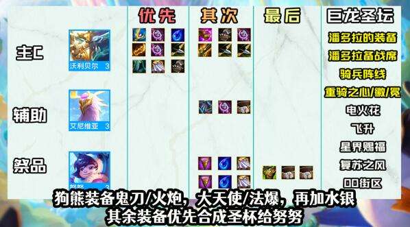 装备优先级:狗熊装备为大天使/法爆 羊刀/火炮必备,第三件装备出水银