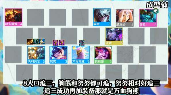 进阶思路:血量太低就在8人口追三,努努相对来讲是最好追三的,狗熊和冰鸟现在都有在热门阵容出现,可能会被卡牌,努努带圣杯这样可以为狗熊二次提升法强,三个半神最好都是暴力出装。