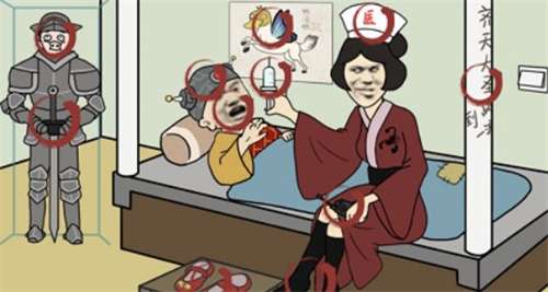 2、图片中躺着的人脸上是【表情包】,头上戴着【测谎仪】,右边的人拿着【对讲机】和【针】,脚上穿着【高筒靴】,头上戴着【护士帽】,地上有【绣花鞋】,墙上挂着【卡通画】,右边的柱子上有【涂鸦】,点击右边墙上的开关,左边的玻璃罩会打开,可以找到【盔甲】,移开面部的盔甲,可以发现里面是【八戒】。