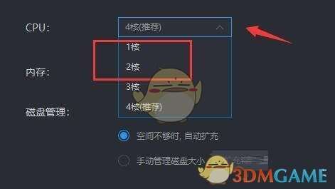 3、展开cpu右侧选项框,降低内核使用数量。降低cpu核数会降低游戏性能,建议在游玩低画质或对配置要求较低的游戏时使用。