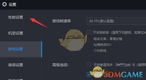 2、然后点击左边栏的“性能设置”。